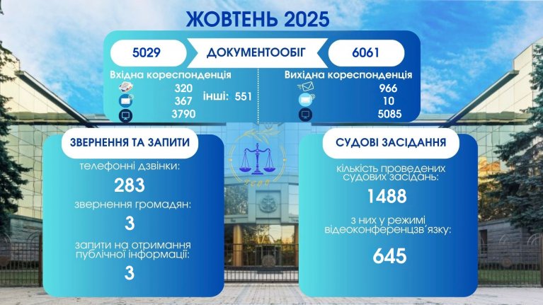 Зокрема, у жовтні 2025 року відбулось 1488 судових засідань, 645 з яких проведено у режимі відеоконференцзв’язку.